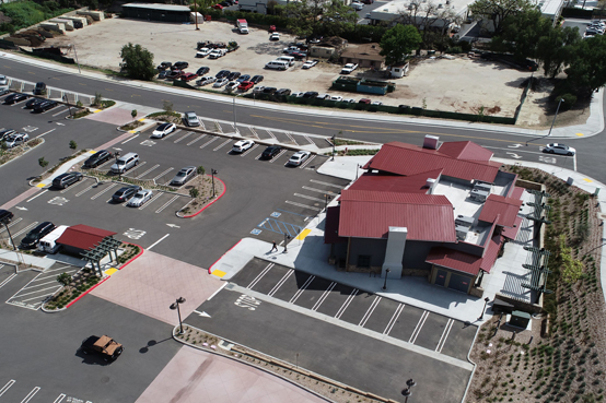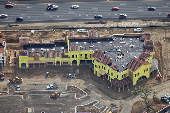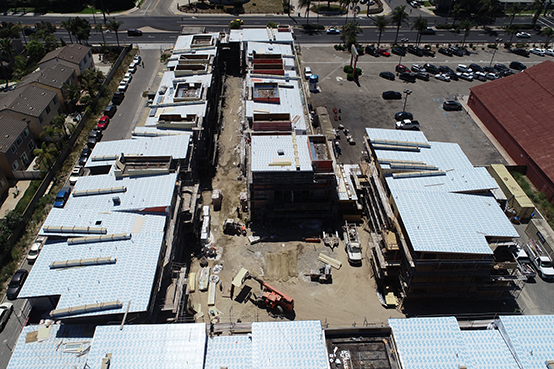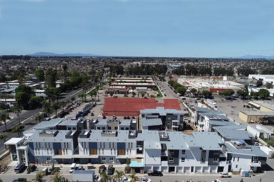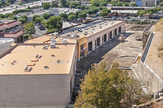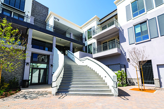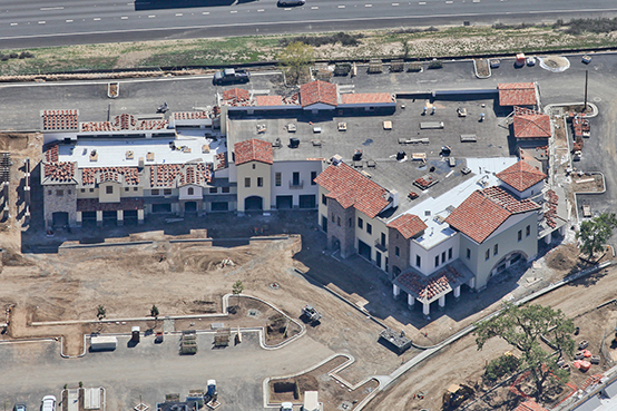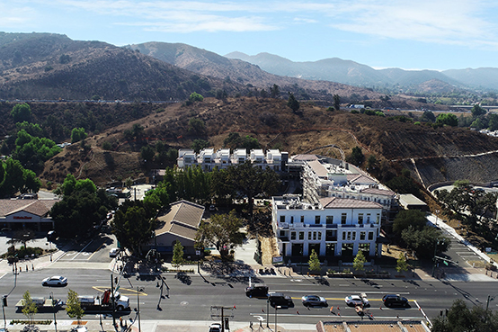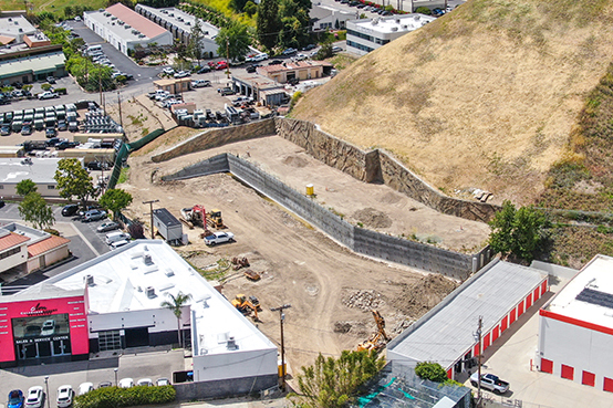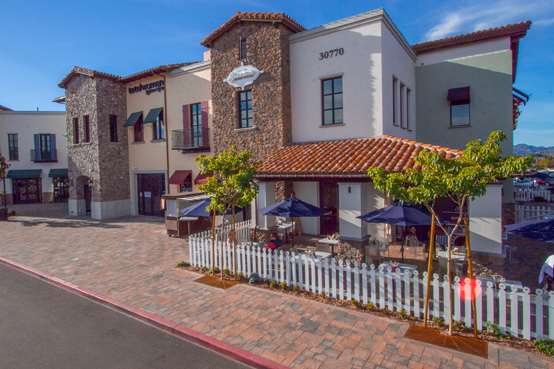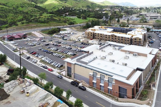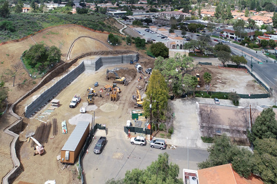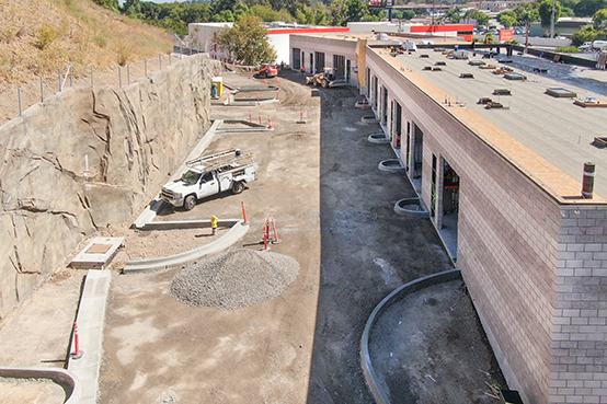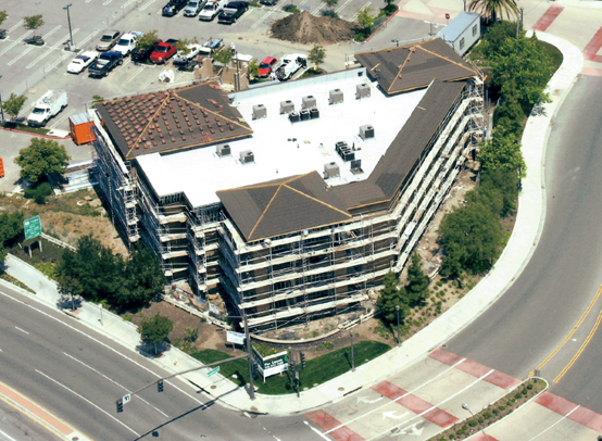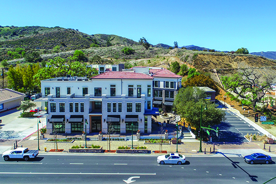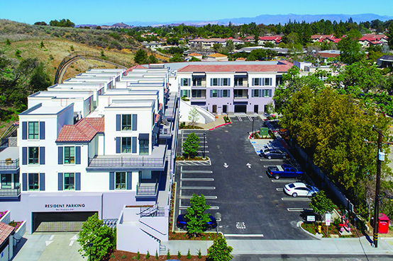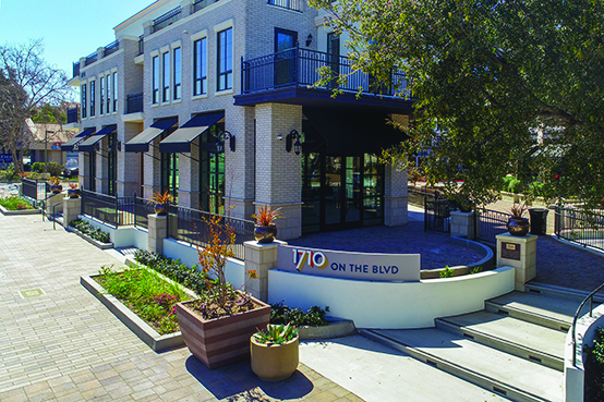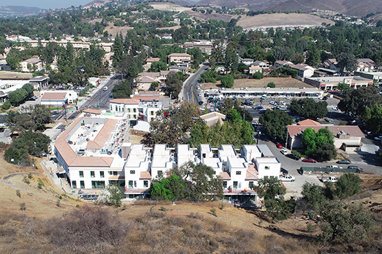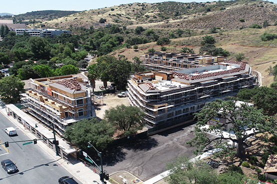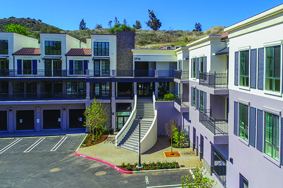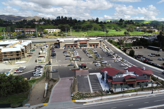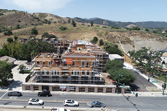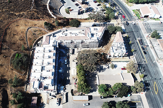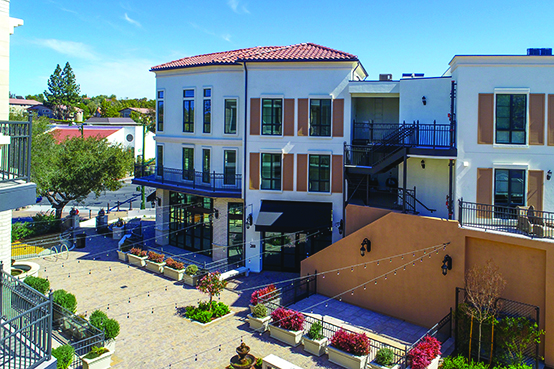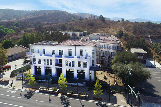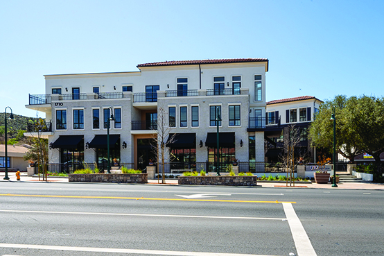 A mixed-use development on 2.7 acres, site includes commercial space and residential space. The 2 buildings, 3 stories, Building “A” at 50,790 sq.ft. and Building “B” at 6,976 sq.ft., 36 residential units include a podium deck, a club/gym, a BBQ and pool area. An exterior courtyard between the buildings with overhead string lights, fountains, and landscaping. 2 commercial restaurant spaces total of 5,823 sq.ft., Gross Floor Area is 59,298 sq.ft., Courtyard 3,501 sq.ft., and Parking Garage 21,883 sq.ft.. Site improvements include colored and textured soil nail walls, AC paving, colored concrete paving, pre-cast colored pavers, a wooden deck, and landscaping throughout to give the development a Mediterranean feel.