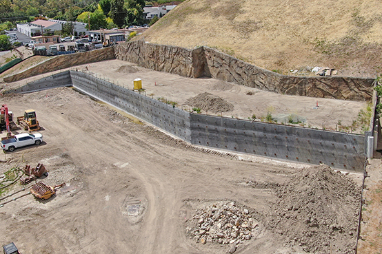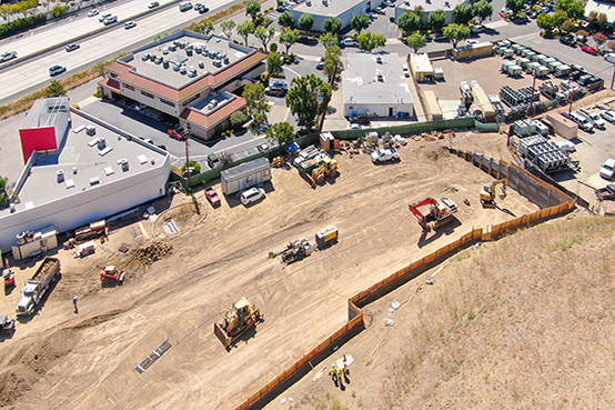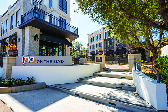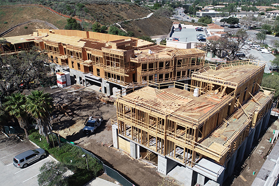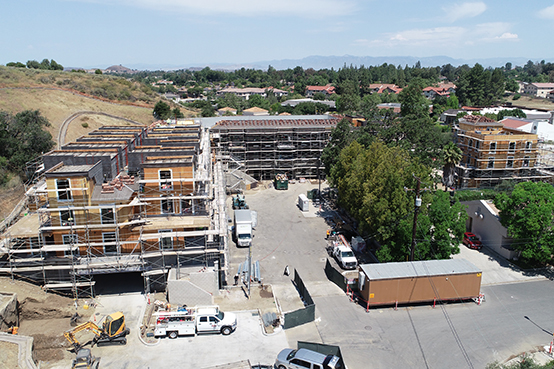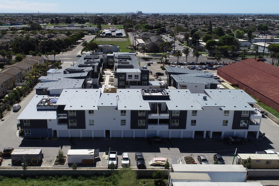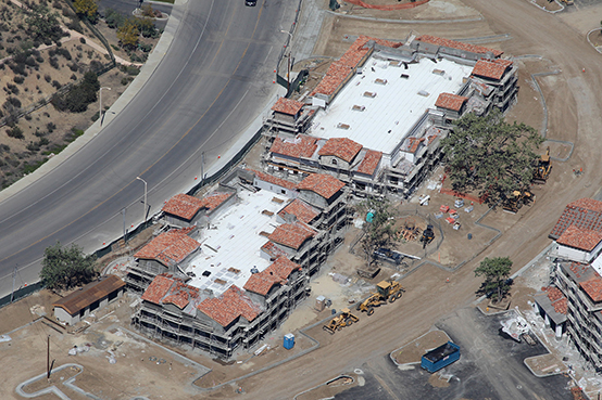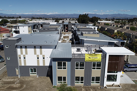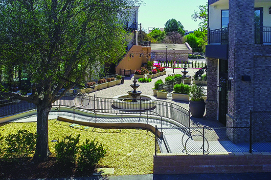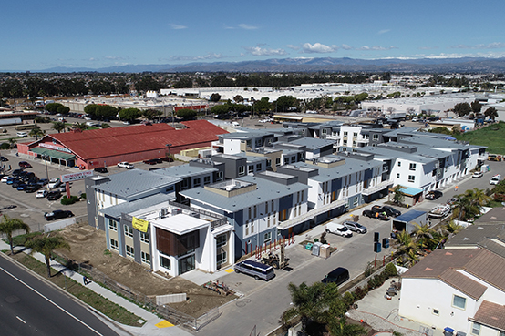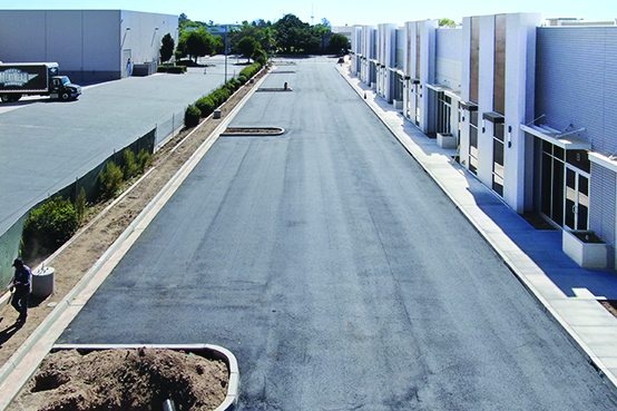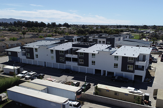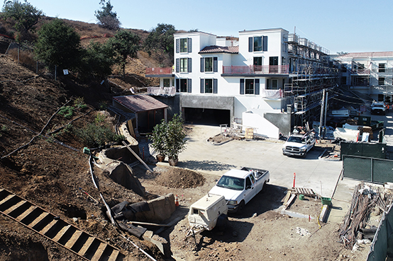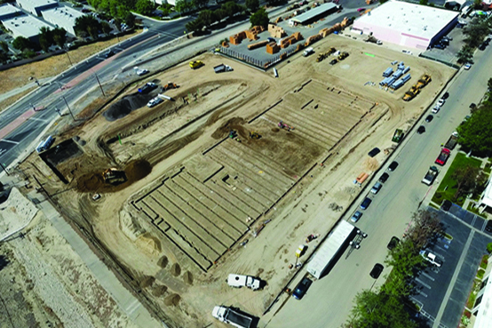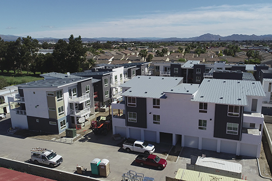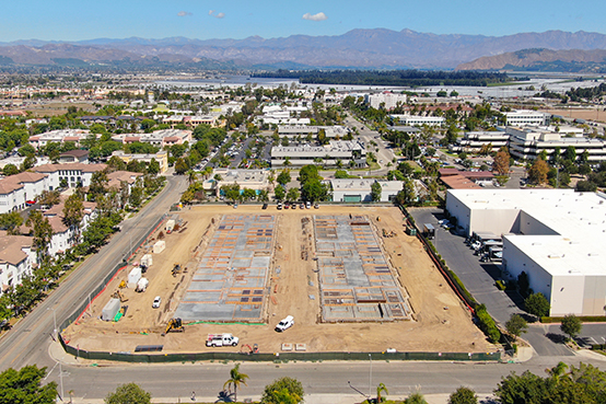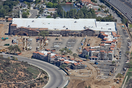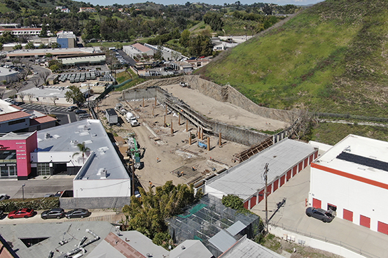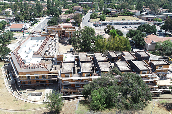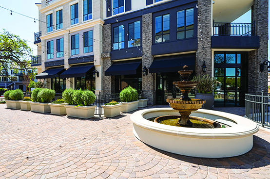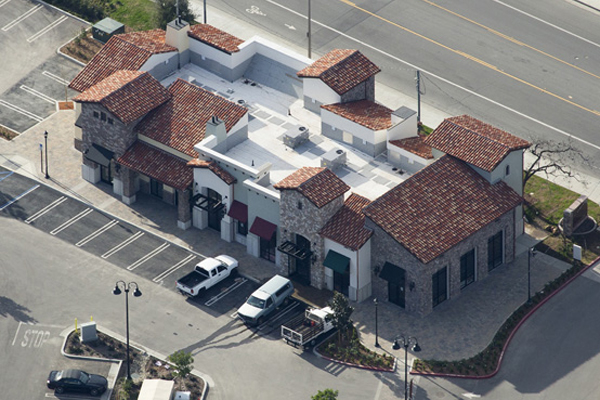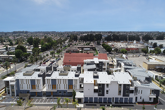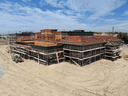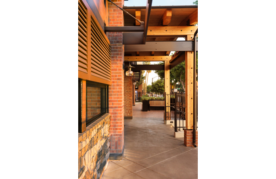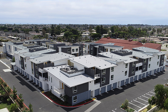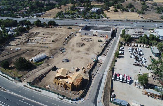 A mixed-use development on 2.7 acres, site includes commercial space and residential space. The 2 buildings, 3 stories, Building “A” at 50,790 sq.ft. and Building “B” at 6,976 sq.ft., 36 residential units include a podium deck, a club/gym, a BBQ and pool area. An exterior courtyard between the buildings with overhead string lights, fountains, and landscaping. 2 commercial restaurant spaces total of 5,823 sq.ft., Gross Floor Area is 59,298 sq.ft., Courtyard 3,501 sq.ft., and Parking Garage 21,883 sq.ft.. Site improvements include colored and textured soil nail walls, AC paving, colored concrete paving, pre-cast colored pavers, a wooden deck, and landscaping throughout to give the development a Mediterranean feel.